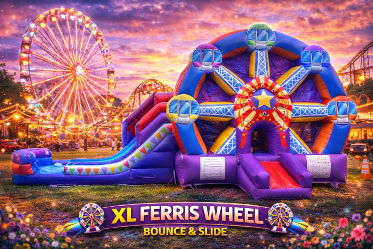 Make your event look next-level. This XL Ferris Wheel combo is a showstopper with tons of activity—kids can bounce, climb, and choose between two slide lanes for nonstop fun. In the summer, add water for a splashy slide experience.