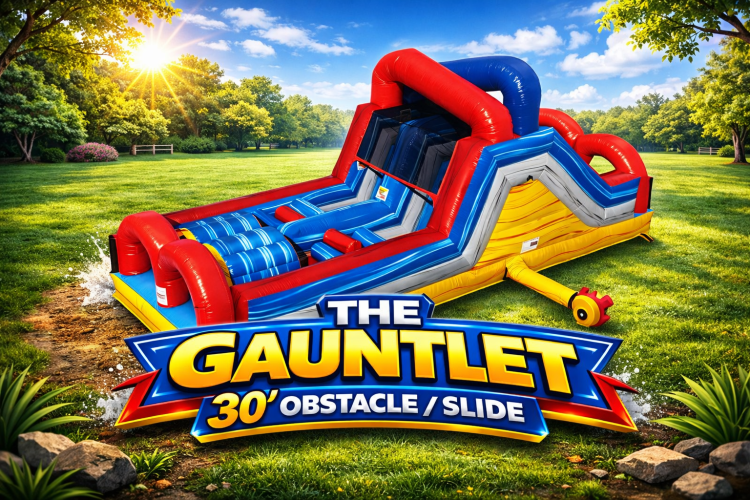 30' The Gauntlet w/ Slide – Obstacle Course is a high-energy race course with an exciting slide finish—perfect for schools, church events, team parties, and backyard events in Clarksville, TN. Pick your date, book online, and we’ll handle delivery, setup, and pickup.