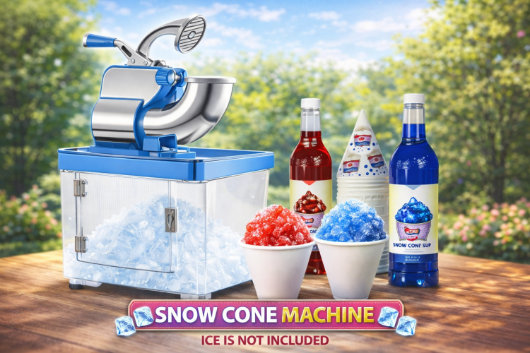 - Any included accessories listed on this page (ex: scoop, cones/bags, sugar if included)