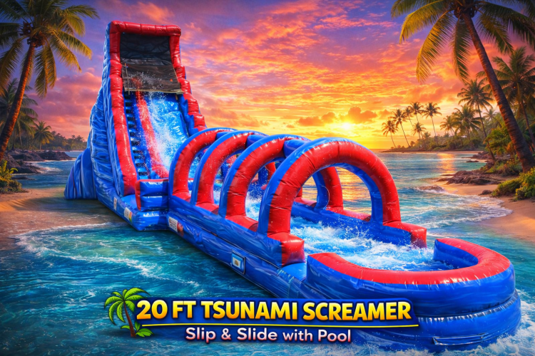 20 ft Tsunami Screamer w/ Slip & Slide & Pool is a high-energy water attraction that brings the WOW to birthdays, schools, church events, and backyard parties in Clarksville, TN. Pick your date, book online, and we’ll handle delivery, setup, and pickup.