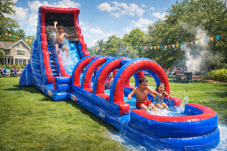 This unit combines a tall slide with an extended slip & slide lane and a splash pool landing for nonstop summer fun. It’s a great choice when you want a bigger feature for larger parties and high-energy crowds.